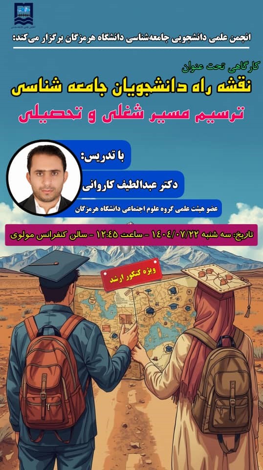 انجمن علمی دانشجویی جامعه‌شناسی دانشگاه هرمزگان، با هدف ارتقای آگاهی و توانمندسازی دانشجویان، کارگاه تخصصی "نقشه راه دانشجویان جامعه‌شناسی: ترسیم مسیر شغلی و تحصیلی" را برگزار می‌کند.