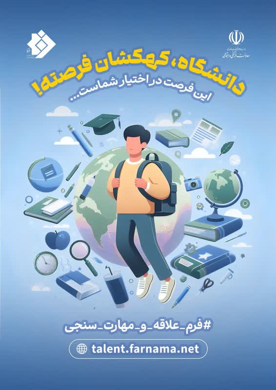 دانشگاه فرصتی برای رشد، کسب تجربه و پیدا کردن مسیر زندگی است. لطفاً برای شناسایی استعدادهایتان و بهره‌مندی از برنامه‌های متناسب، فرم مهارت‌سنجی را در آدرس talent.farnama.net تکمیل کنید.