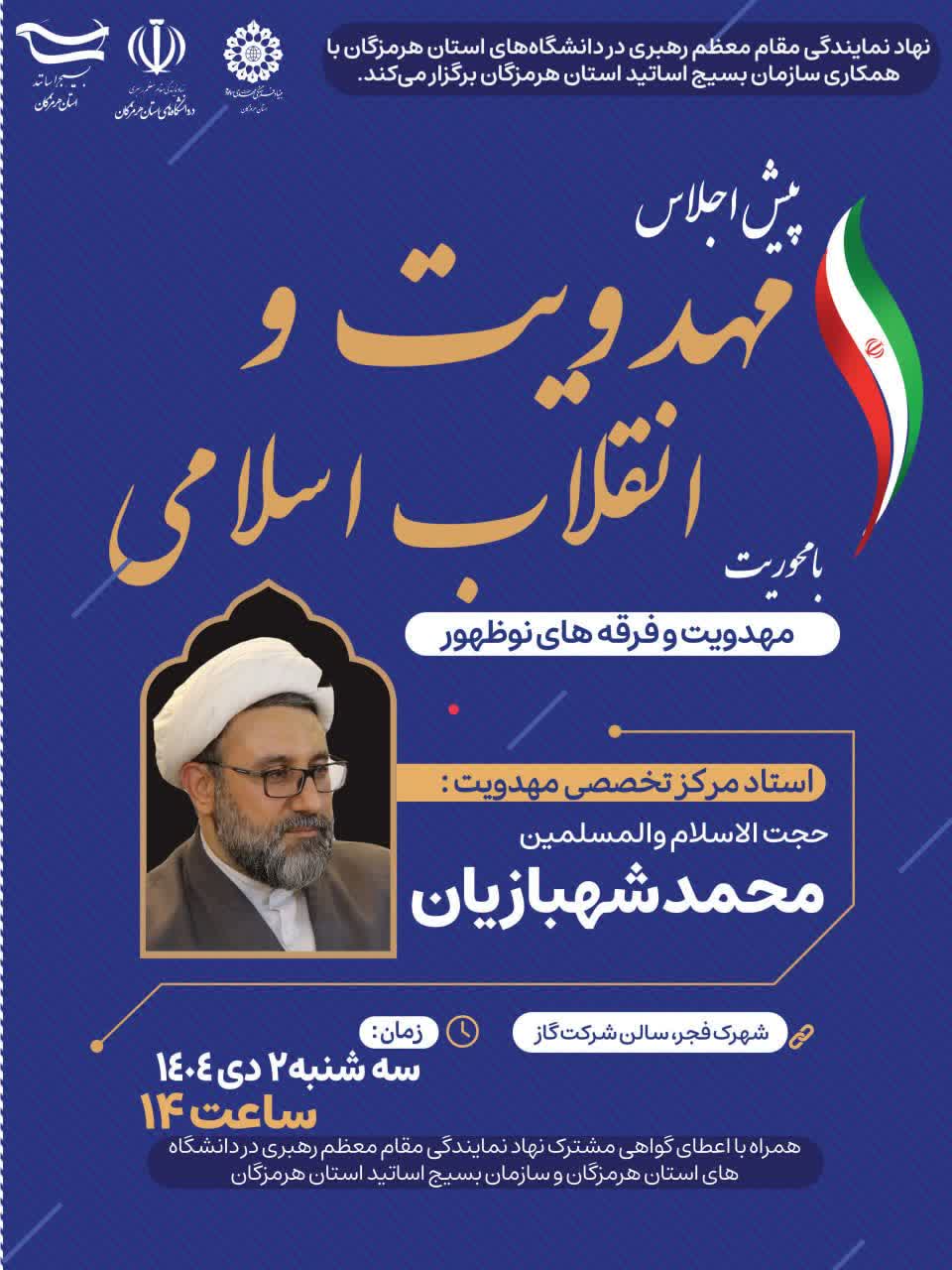 پیش‌اجلاس «مهدویت و انقلاب اسلامی» با حضور حجت‌الاسلام والمسلمین محمد شهبازیان، استاد مرکز تخصصی مهدویت، روز سه‌شنبه ۲ دی‌ماه در شهرک فجر برگزار می‌شود. در این نشست، موضوع مهدویت و نقد فرقه‌های نوظهور با رویکردی تحلیلی و علمی مورد بررسی قرار خواهد گرفت