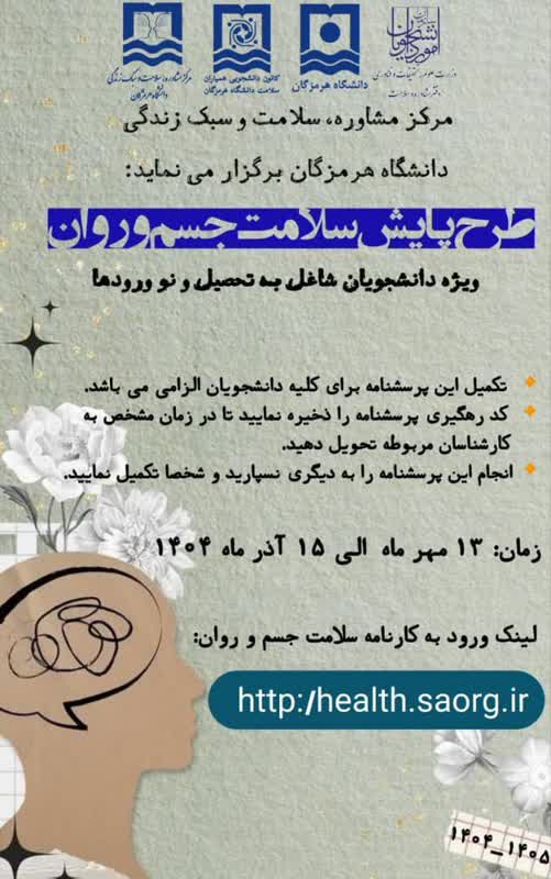 • 11- کلیه دانشجویان ورودی جدید می بایست به سامانه جامع پایش سلامت وارد گردیده و اقدام به تکمیل کارنامه سلامت جسم و روان نمایند.
