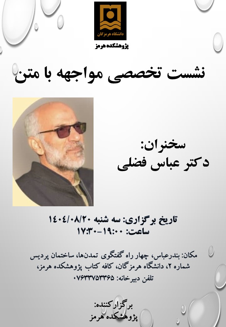 نشست تخصصی مواجهه با متن توسط دکتر عباس فضلی روز سه شنبه مورخ 20 آبان ماه 1404 ساعت 17:30 لغایت 19:00 در کافه کتاب پژوهشکده هرمز دانشگاه هرمزگان برگزار می گردد.